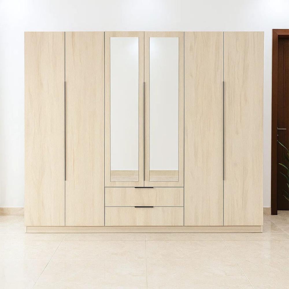 خزانة ملابس أنيقة بـ 6 أبواب بتصميم مودرن فخم، مزودة بمرآتين في المنتصف لراحة الاستخدام اليومية، و2 أدراج سفلية لتنظيم الأدوات والملابس الصغيرة.