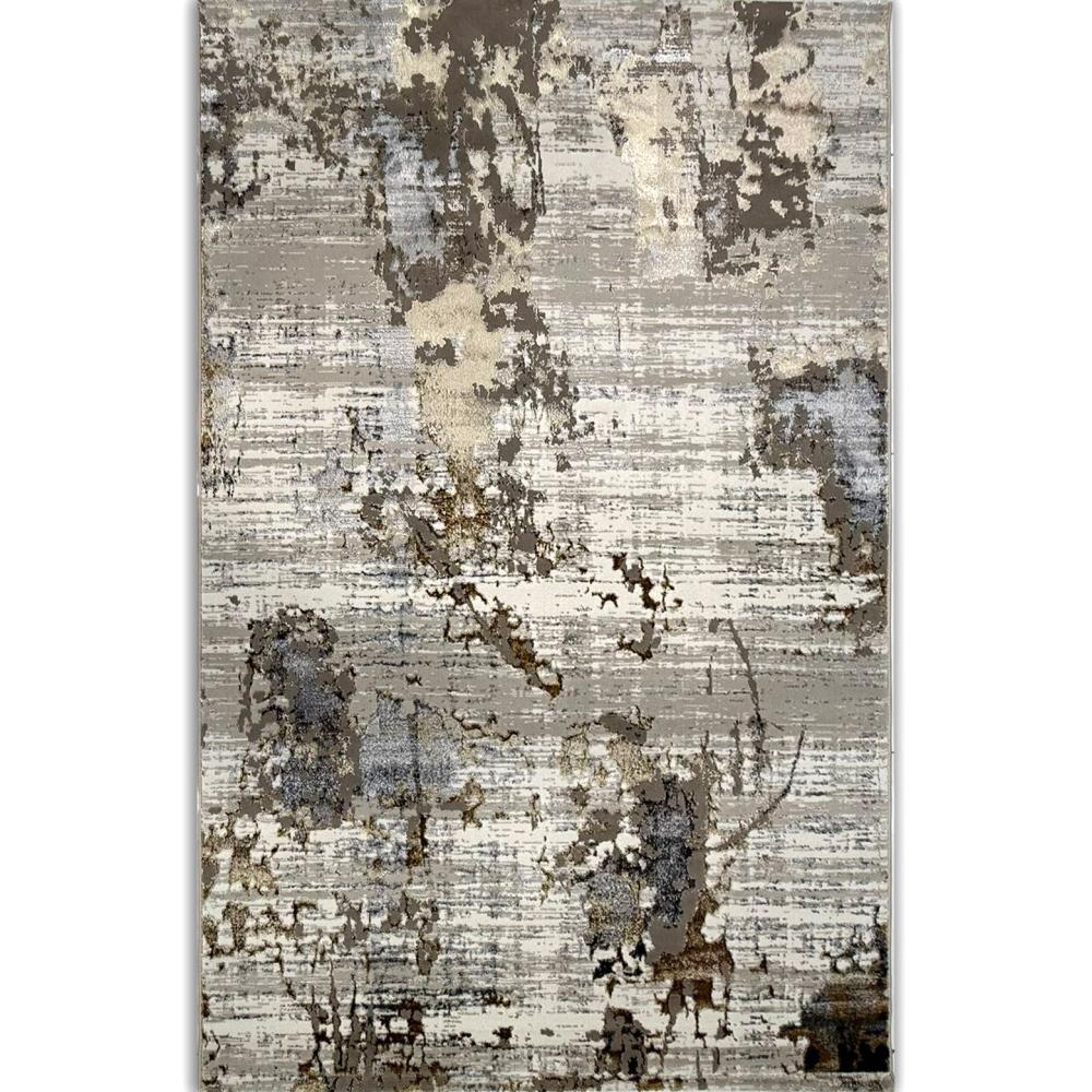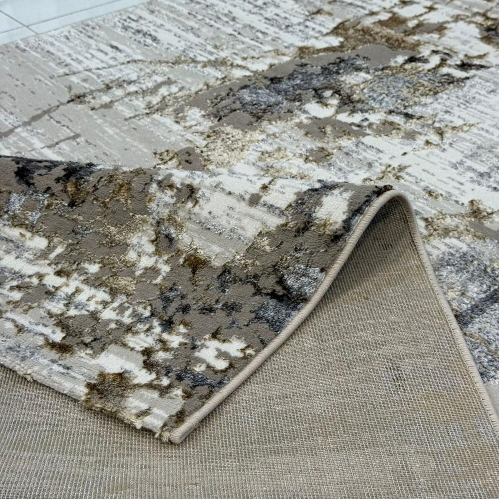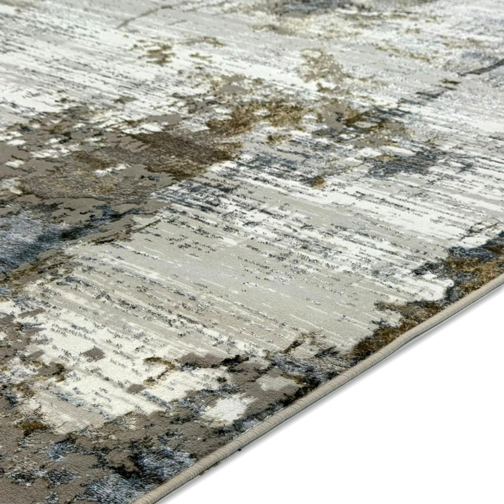 سجادة فريدة بتصميم يشبه اللوحات التجريدية بألوان ترابية دافئة مثل البيج والرمادي والبني، تضيف لمسة فنية وأنيقة لأي مساحة