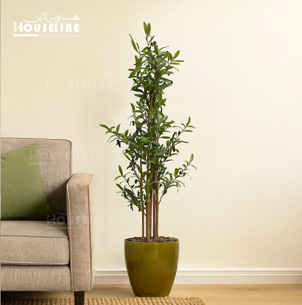 شجرة ديكور صناعية بتصميم أنيق وطولي، تحتوي على أوراق خضراء ناعمة بتوزيع طبيعي جذاب، داخل مركن زيتوني لامع يضيف لمسة دافئة للمكان.