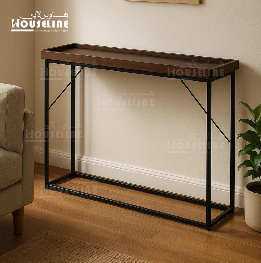 طاولة مدخل أنيقة بتصميم مستطيل بسيط ومتين، مصنوعة بإطار معدني أسود خفيف الشكل لكنه قوي، مع سطح علوي خشبي بني داكن بملمس ناعم وحواف مرتفعة تضيف لمسة عملية تحافظ على الأغراض في مكانها.