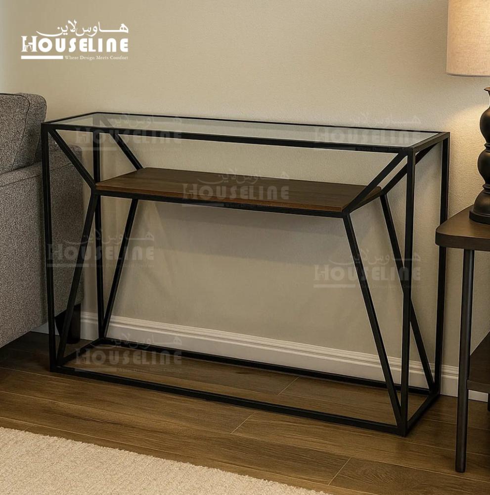 طاولة مدخل عصرية بتصميم هندسي مبتكر يلفت الأنظار، مصنوعة من إطار معدني أسود يعطيها ثبات وأناقة، مع سطح زجاجي شفاف يكشف عن رف داخلي خشبي بلون بني غامق.