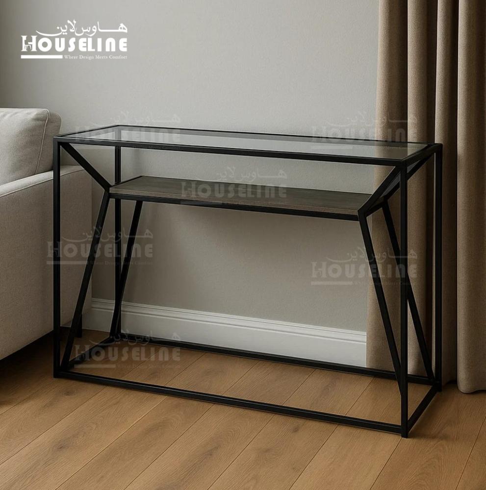 طاولة مدخل بتصميم هندسي أنيق وعصري، تضيف لمسة فنية لأي مساحة. الإطار المعدني الأسود يمنحها ثبات وأناقة، بينما يكشف السطح الزجاجي العلوي عن رف داخلي خشبي يوفر مساحة عملية للعرض أو التخزين. خطوطها المائلة تضيف بعد بصري مميز يجعلها قطعة محورية في مدخل بيتك.