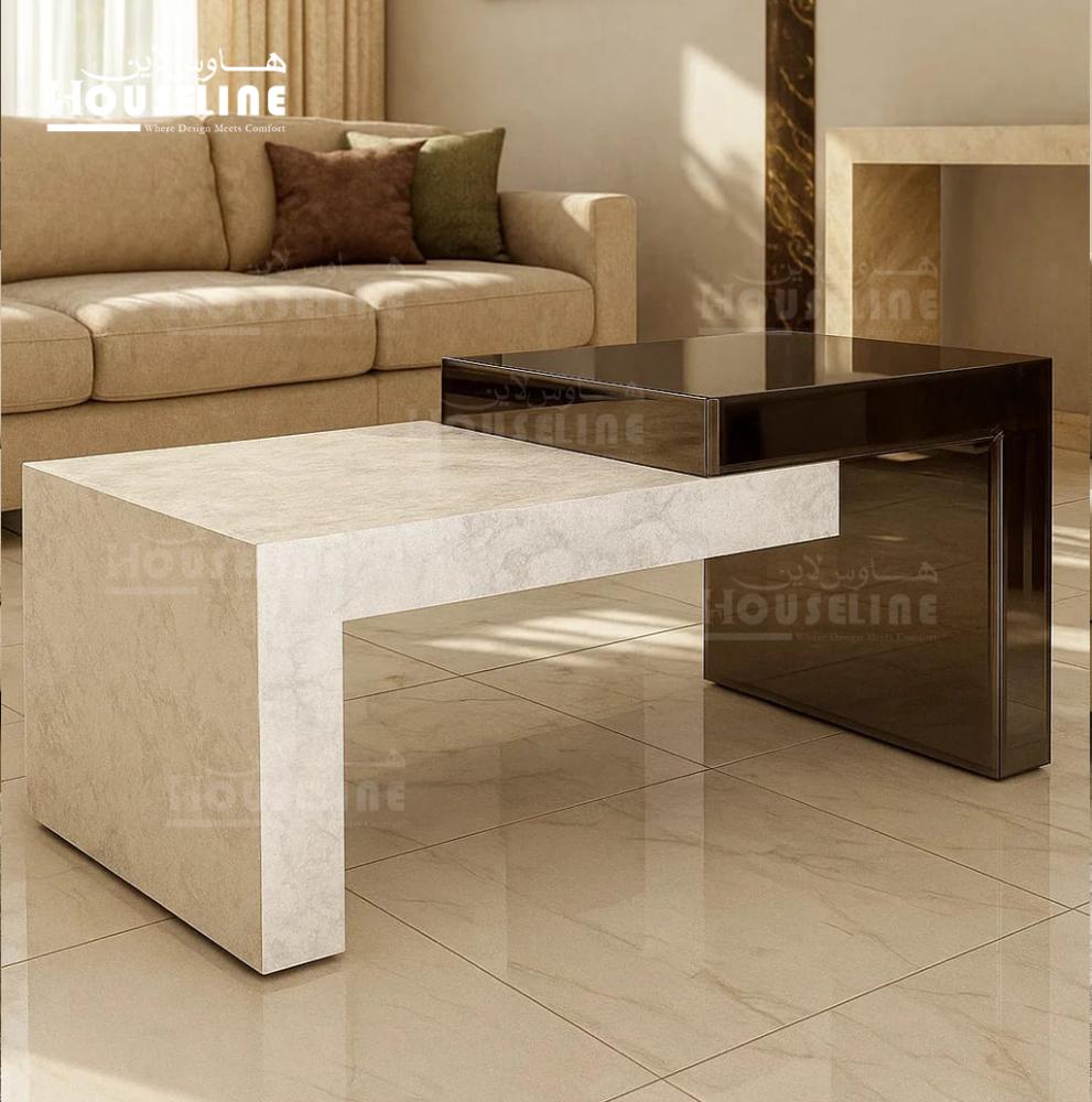 الطاولة الأولى بتشطيب بيج رخامي مطفي يعكس أناقة طبيعية وهادئة، أما الثانية بتشطيب أسود لامع يعطي فخامة ولمعان لافت. التصميم المتداخل على شكل حرف "L" يتيح لك تنسيقها بطريقة مرنة حسب المساحة.