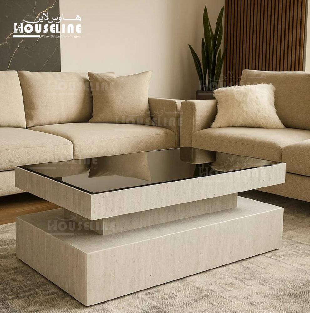 القاعدة مربعة بتشطيب بيج رخامي مطفي يضفي دفء وأناقة للمكان، ويعلوها سطح أسود لامع يعكس الإضاءة ويزيد من فخامة الطاولة. تصميمها الطبقي يجعلها قطعة ملفتة وجذابة توازن بين الحداثة والبساطة.