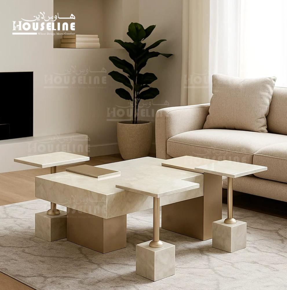 طقم طاولات فاخر بتصميم فني غير تقليدي، مكوّن من طاولة وسط كبيرة وأربع طاولات جانبية صغيرة. يتميز بتفاصيل هندسية عصرية تجمع بين الملمس الرخامي الأنيق والقاعدة المعدنية الذهبية بتصميم مكعب يعطي ثبات وجاذبية.