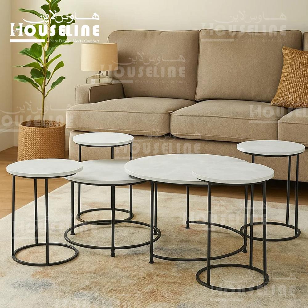 طقم طاولات قهوة فاخر من هاوس لاين بتصميم عصري يجمع بين الأناقة والعملية. يأتي بسطح بديل الرخام الأبيض الفاخر الذي يضفي لمسة فخامة على أي مساحة، مع قاعدة معدنية متينة تمنح الطاولات ثبات وقوة. التصميم الدائري المتناسق يجعل الطقم مثالي للاستخدام كطاولات وسط أو جانبية، ويمكن توزيع القطع بسهولة بما يتناسب مع احتياجاتك.
