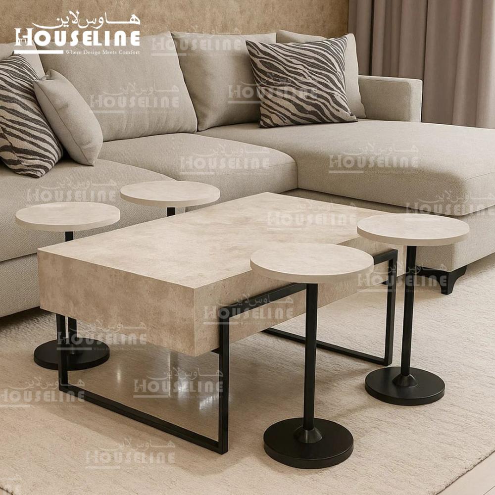 السطح بلون بيج يشبه الرخام يمنح الطاولات لمسة فاخرة، بينما تضيف القاعدة المعدنية السوداء ثبات ومتانة.
