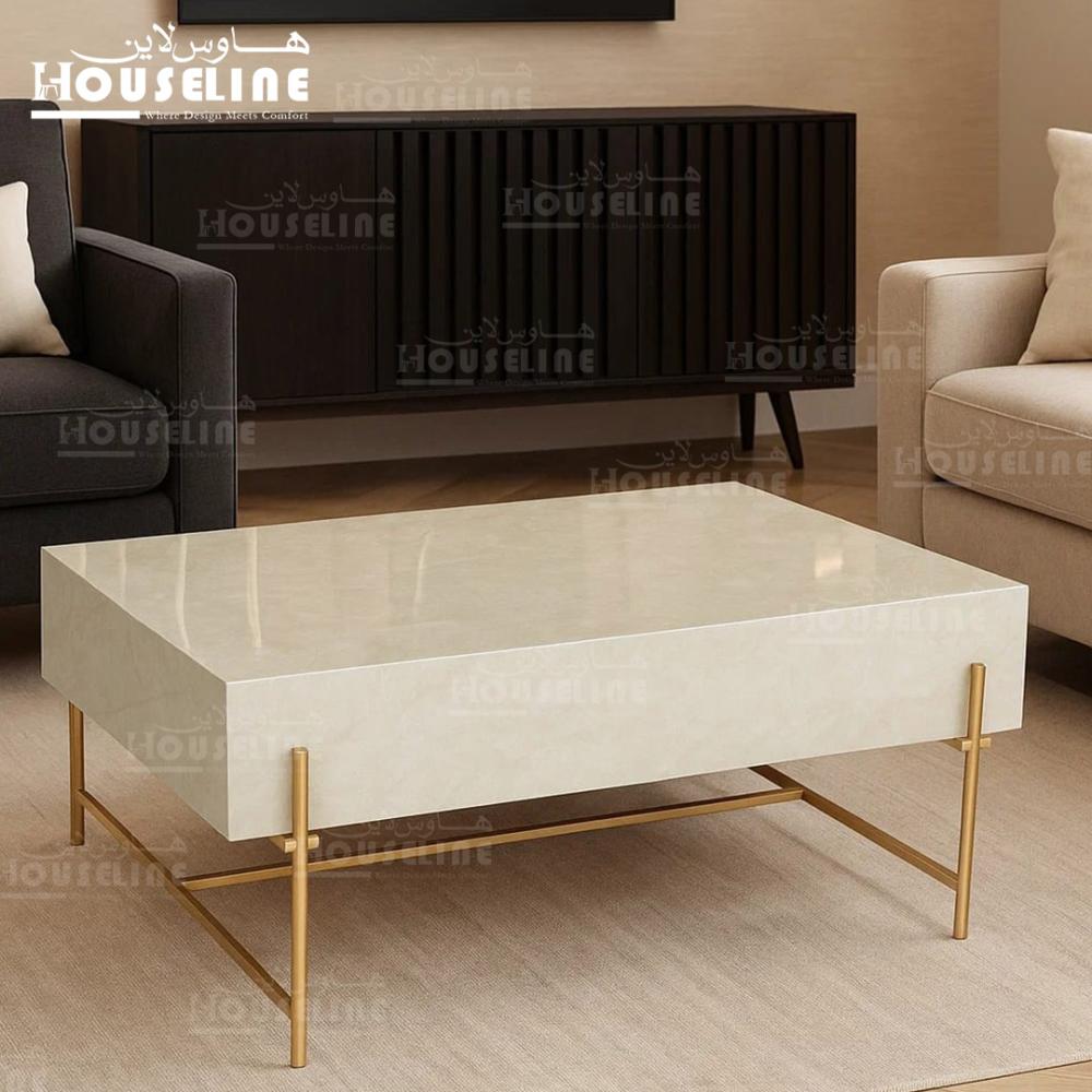 السطح بلون بيج رخامي لامع يعكس الضوء ويمنح فخامة، والقاعدة المعدنية الذهبية تضيف لمسة أنيقة ومناسبة لأجواء المجالس والصالات الراقية.