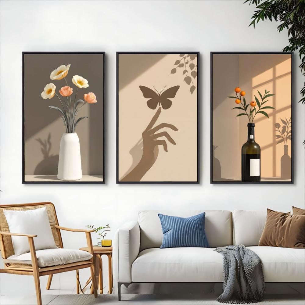 أضف لمسة دافئة لجدران منزلك مع طقم 3 لوحات جدارية أنيقة بتصميم عصري يجمع بين الطبيعة والظلال. اللوحة الأولى تحتوي على زهور جميلة في مزهرية، الثانية تجسد فراشة رقيقة تحط على إصبع يد، والثالثة تعرض غصن برتقال صغير في زجاجة بسيطة. ألوان هادئة وتفاصيل عصرية تمنح المكان طابع مريح وراقي.