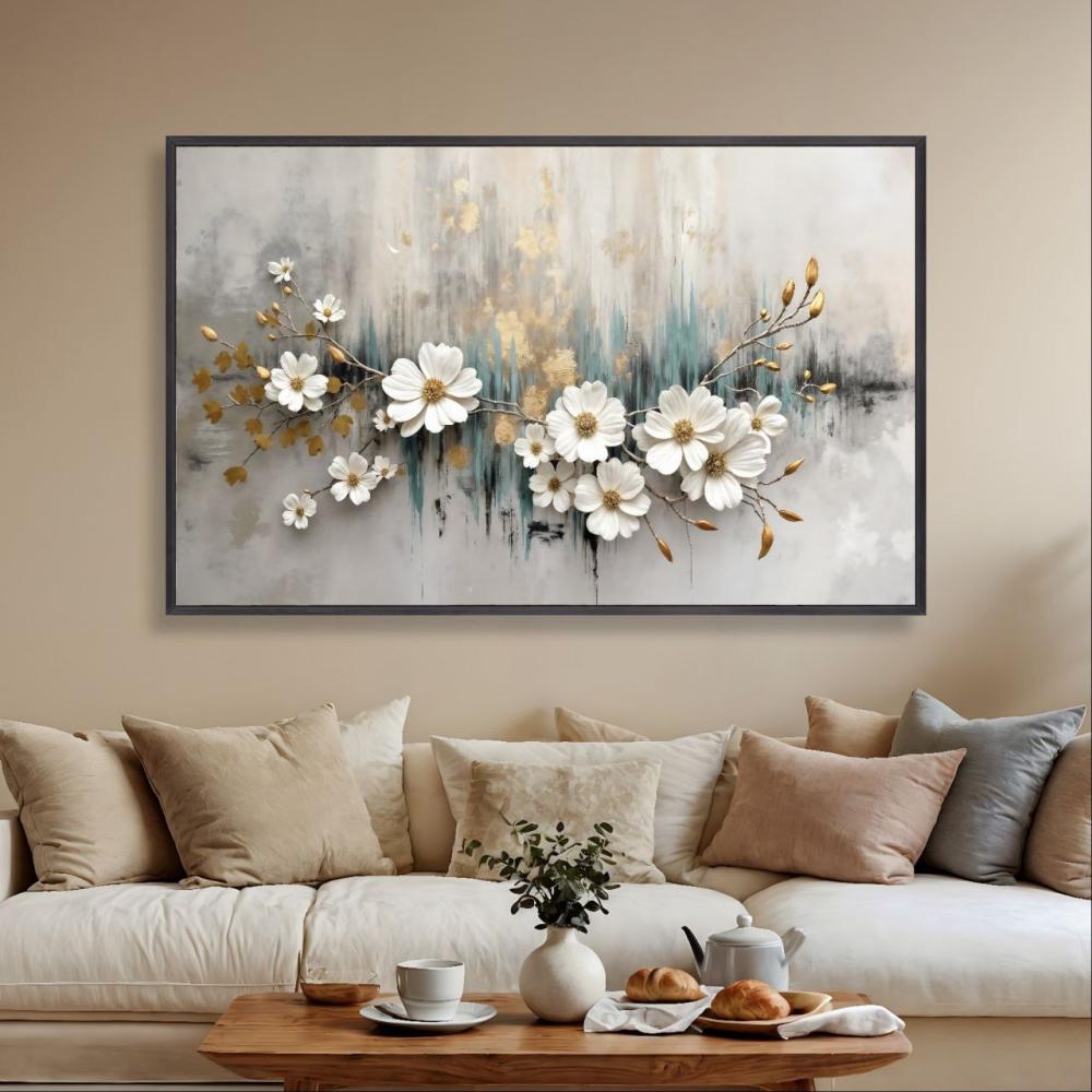 لوحة جدارية فاخرة بتصميم ثلاثي الأبعاد يدمج بين الأزهار البيضاء الناعمة والأوراق الذهبية اللامعة، مع خلفية فنية بدرجات الرمادي والأزرق تمنح عمق وأناقة للمكان. مثالية لإضافة لمسة راقية وجذابة لغرف المعيشة أو المداخل.