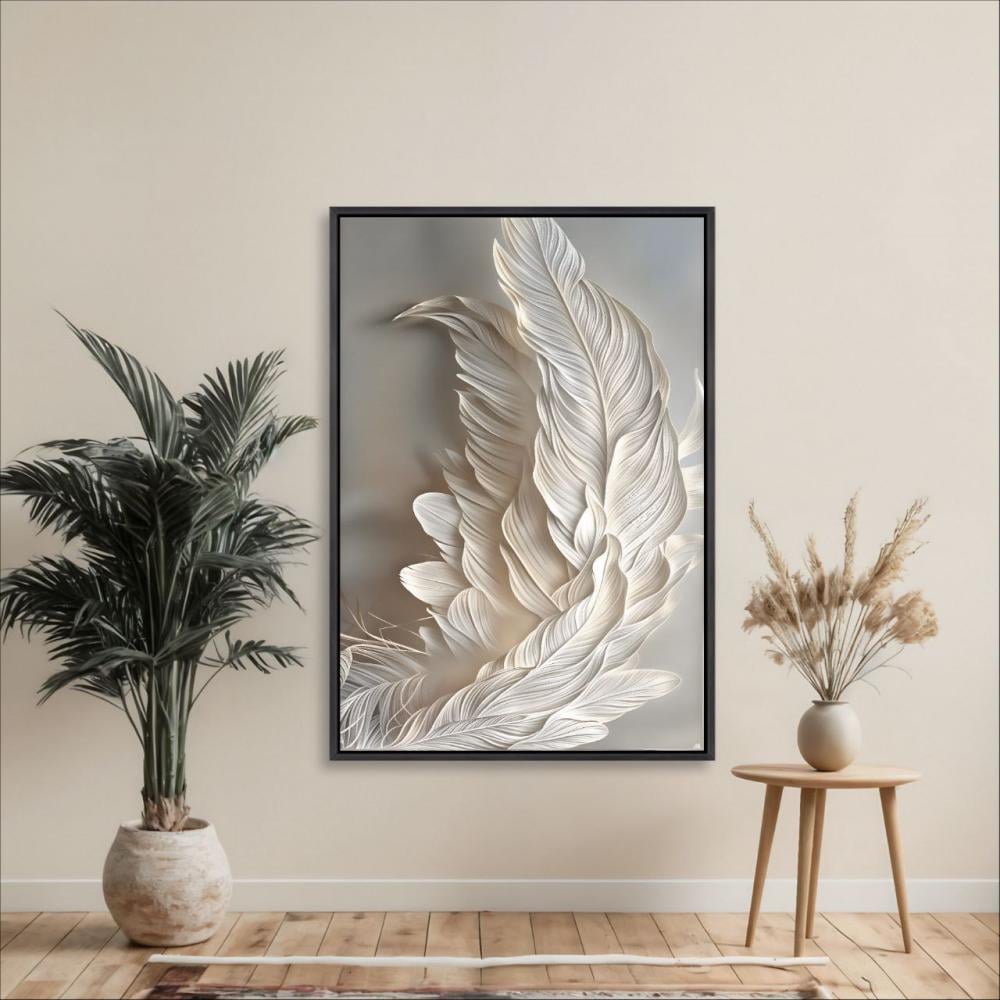 لوحة فنية راقية تجمع بين البساطة والفخامة، تصور تفاصيل دقيقة لريش أبيض متناغم يمنح إحساس بالسكينة والصفاء. الألوان الهادئة الممزوجة بالبيج والرمادي تجعلها خيار مثالي لإضافة لمسة أنيقة إلى جدران المنزل أو المكتب.