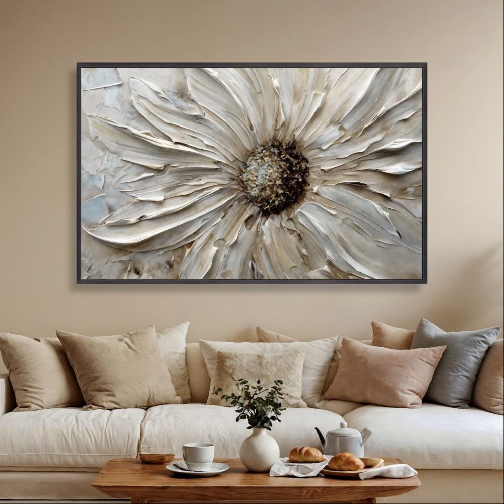 جدد جدار بيتك بلمسة أنيقة مع لوحة جدارية لزهرة كبيرة بتفاصيل فنية راقية. ألوانها الهادئة بين البيج، الرملي، والرمادي تعكس جمال الطبيعة وتعطي المكان إحساس بالراحة والرقي.