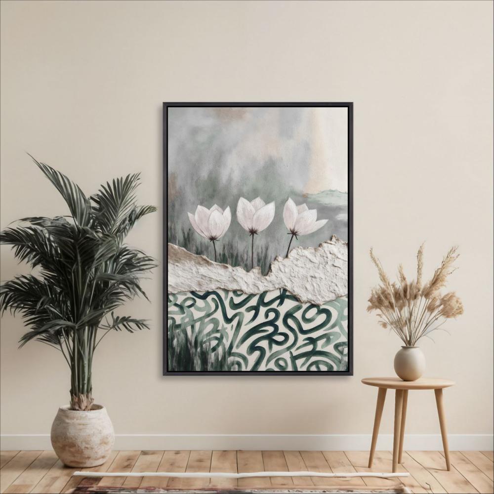 أضف لمسة فنية راقية لجدارك مع لوحة جدارية طولية مطبوعة على كانفس بتصميم يجمع بين زهور التوليب البيضاء المشرقة والزخارف العصرية بأسلوب مبتكر يدمج بين الطبيعة والفن.